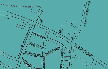 About 10-12 yards farther down the road the boys met Lexie Lynch, who warned the boys, "not to go any farther as the army were coming down the alleyways of the houses." On hearing this, Christopher said: "We decided to turn and go home." Thomas said that: "Just as he told us I saw two or three soldiers coming down the Watery Lane (Map ref. 3). They stopped at the junction with Creggan Heights. I told Christopher and Daniel about the army." Returning home along the same route, Thomas crossed the street diagonally towards 112-114 Creggan Heights (Map ref. 2) with the other two boys following immediately behind him.